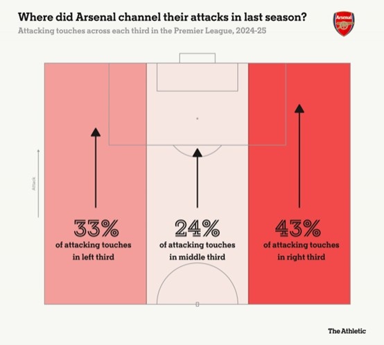 24/25赛季阿森纳更倾向于在右侧发动进攻
