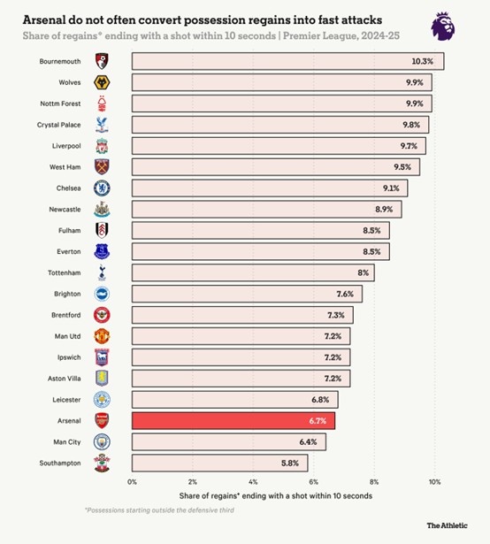 上赛季,只有伯恩茅斯、纽卡斯尔和利物浦在己方防守三区外赢得球权的次数多于阿尔特塔的球队,但如下图所示,阿森纳这些球权中只有6.7%在10秒内转化成了射门(英超中第三低)。