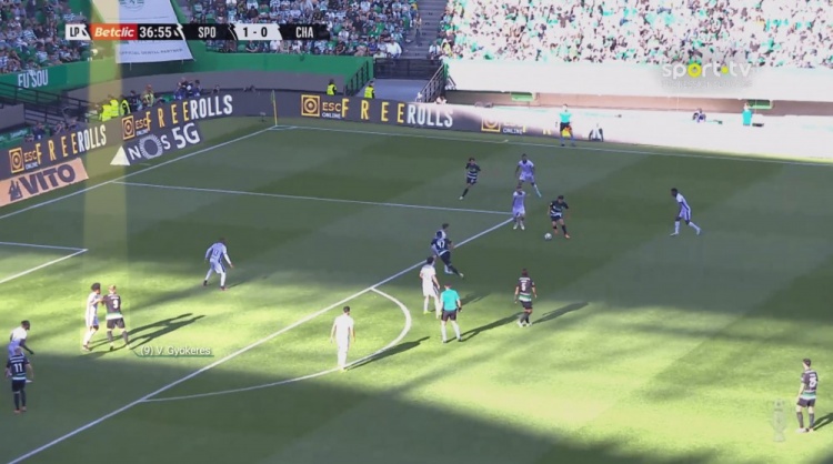 在一次快速的球权转换后,葡萄牙体育将球转移到左侧。约克雷斯毫不犹豫地启动,以全速前插,为队友提供了沿边线的传球选择。即使后卫能跟上,这种极端的跑动也会迫使他们进行盯人交接——中后卫通常不愿意跟着前锋横穿整个球场,进而导致自己完全失去位置。